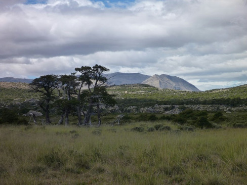 Hiking to the next campsite is almost flat during the scenic four kilometers. Pass through a sparse forest and pass the turnoff to the marked Sendero Madre a Hija hiking trail, which we are going to follow the next day. At the end, cross the wide bed of the Rio Blanco stream over several wooden footbridges. Camp Poincenot is among the low trees.