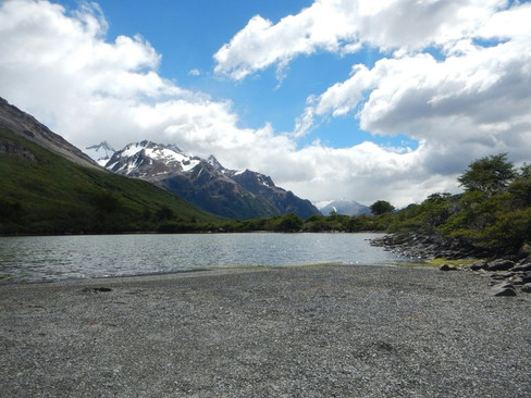 After less than a kilometer to the junction, turn right, towards the Agostini campsite. The Sendero Madre e Hija route is named after two lakes, which in translation mean mother and daughter. The smaller daughter follows after the longer mother. Both are surrounded by low trees and tall grass. Here and there you can approach a small gravel beach.