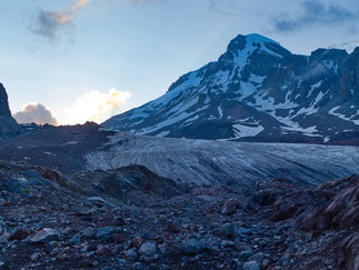 We camp just below the glacier. The map calls it an “Epic place for camping,” so why not. At 3,250 metres, it is perfect for today. Among the boulders we find shelter from the wind and a water source nearby. The views down the valley are epic, and looking up at our objective inspires respect. Only one stray dog passes by. An evening wash in the grey stream flowing directly from the glacier is a little bit abrasive.