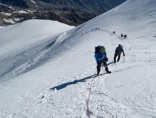 Roped up, we continue ascending. It feels good; acclimatisation is evident. We overtake caravans burdened with an astonishing array of equipment. Fascinating ensembles. Standard gear includes Russian foam-mat harnesses tied on with string, ascenders and ice screws as fashion accessories, boots fit for Everest, and even harnesses worn backwards. Some large groups are roped at two-metre intervals. Local dogs wander among them.