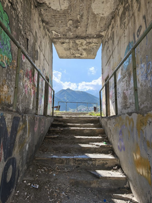 To enter the sanctuary, we must adjust our outfits appropriately. At the door we borrow apron-like scarfs to cover our bare knees. The 14th-century church is one of the most photographed in Georgia. In the 1980s, the Soviet government even built a cable car to it, but locals disliked it and it did not last long. Finding the remains of the lower station in the village below takes some effort. The building, nicknamed the Twin Tower because it resembles a ski jump, now serves as a canvas for street artists.