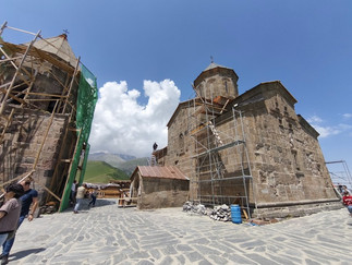 The second day we head into the Truso Valley. The turn-off from the main road lies near the village of Kobi, where the new tunnel will emerge and where a cable car leads to Gudauri. Our route goes the opposite direction past an abandoned mining complex. We rattle along to the village of Kvemo Okrokana and continue on foot, though vehicles occasionally pass along the dusty road. After about an hour we reach the famous travertine monument. Hot mineral springs gush from the rock, forming terraces and shallow warm pools. Jeeps from local agencies drive shamelessly across this natural spectacle. A little further on we find the bubbling Lake Albano. Carbon dioxide rises from the depths, making it look as though divers are swimming below the surface. Lingering here in calm weather is not recommended. The Truso Valley also boasts a medieval history, with once-renowned monasteries in Abano and Ketrisi. We, however, head back to Stepantsminda — and tomorrow to the metropolis