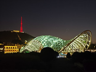 As we descend, the temperature steadily rises — eventually reaching over thirty degrees. One night remains in Tbilisi: an evening stroll, a full day of urban exploration, a farewell dinner, and a night flight home. I know Tbilisi fairly well, yet there is always more to discover. The contrasts between old and new architecture never cease to amaze me. Summer tourism fills the streets; the city centre remains lively late into the night. Our accommodation boasts an excellent location and wildly eclectic décor.
