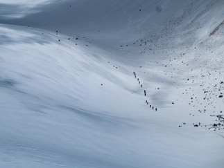 From where the “marked” route ends on the map, a brittle ridge leads to the summit — a mix of wind-scoured snow and loose scree crumbling under the ice axe. We settle for a lower fore-summit and descend to the sheltered saddle for lunch. We watch strings of climbers below. It is already late, yet some are still heading up. Today we focus on rest before tomorrow’s summit attempt.